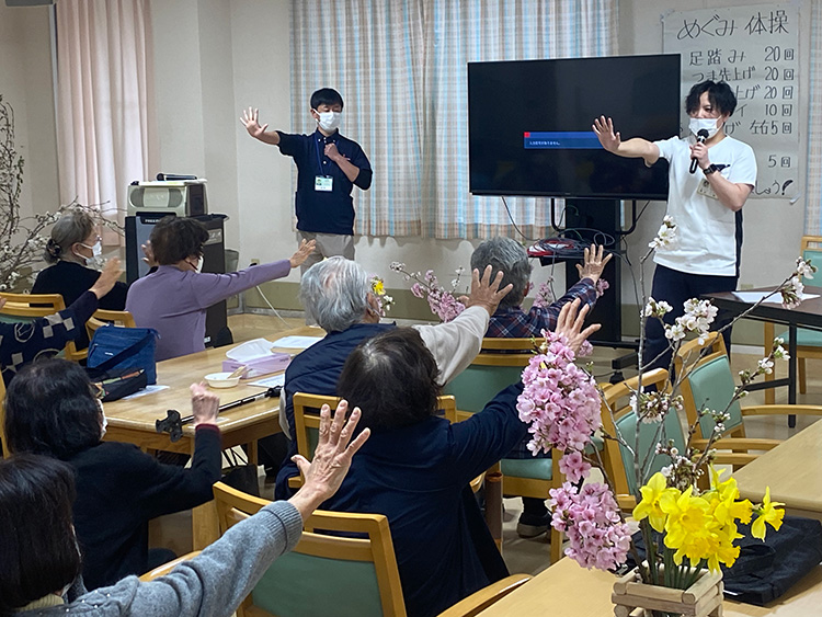 最後に、めぐみの理学療法士による「脳のトレーニング体操」を職員と一緒に行いました。